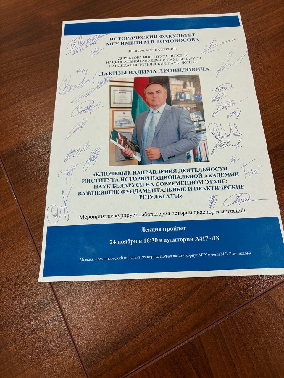 24 ноября 2025 года на историческом факультете МГУ имени М.В.Ломоносова состоялась лекция директора Института истории Национальной академии наук Беларуси, члена Республиканского совета по исторической политике при Администрации Президента Республики Беларусь, руководителя Белорусской рабочей группы Экспертно-консультативного российско-белорусского совета по истории, представителя Российского военно-исторического общества в Республике Беларусь к.и.н. доцента Лакизы Вадима Леонидовича на тему «Ключевые направления деятельности Института истории Национальной академии наук Беларуси на современном этапе: важнейшие фундаментальные и практические результаты».